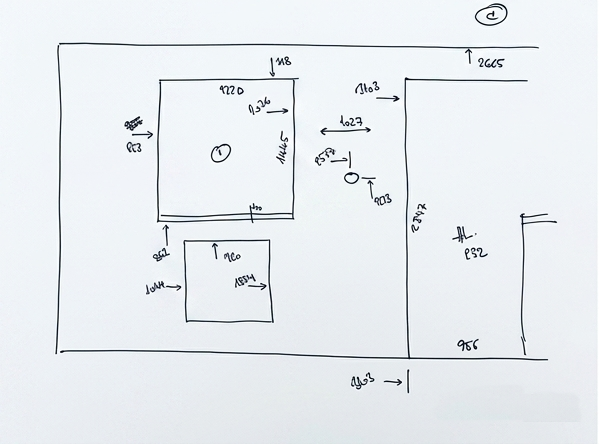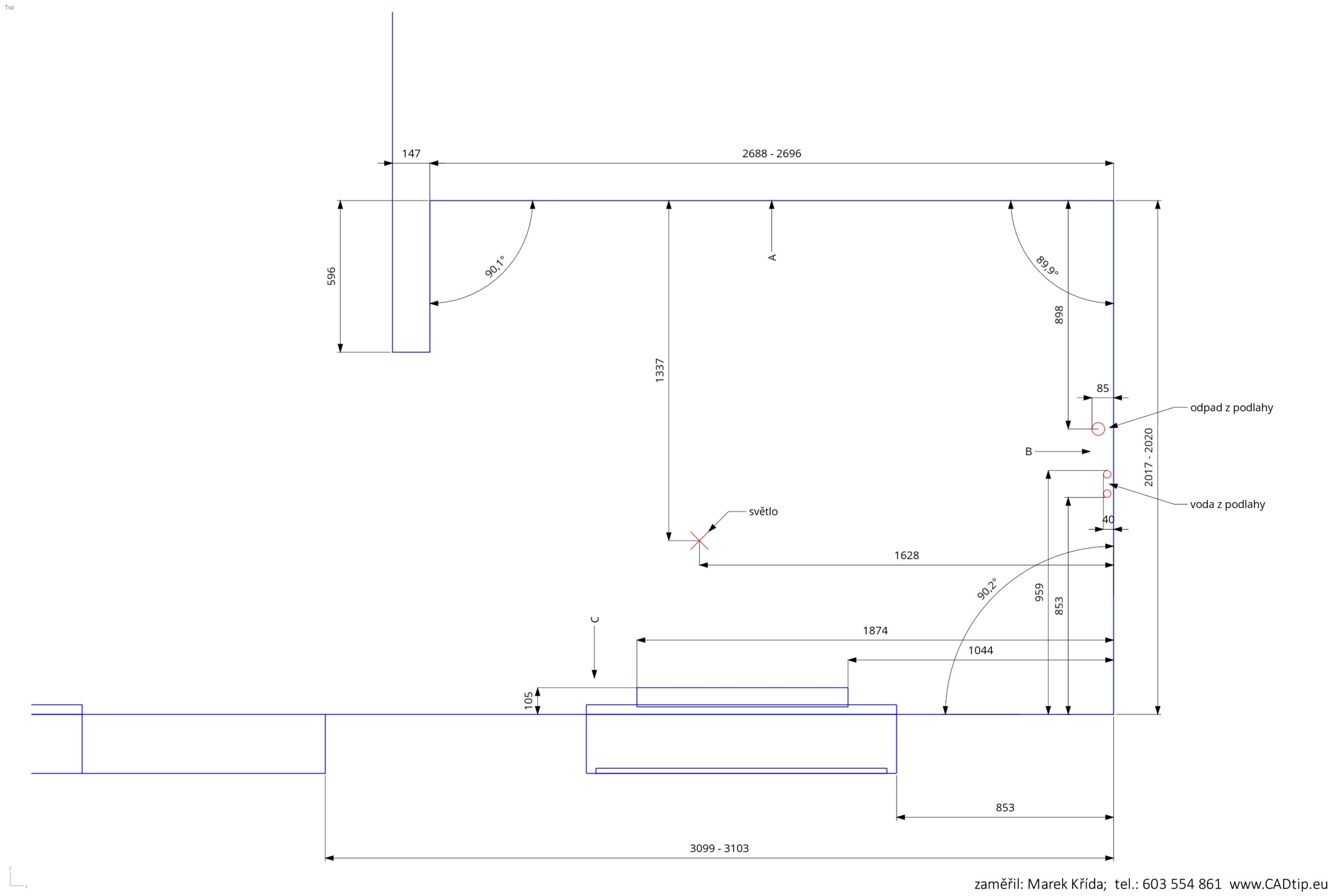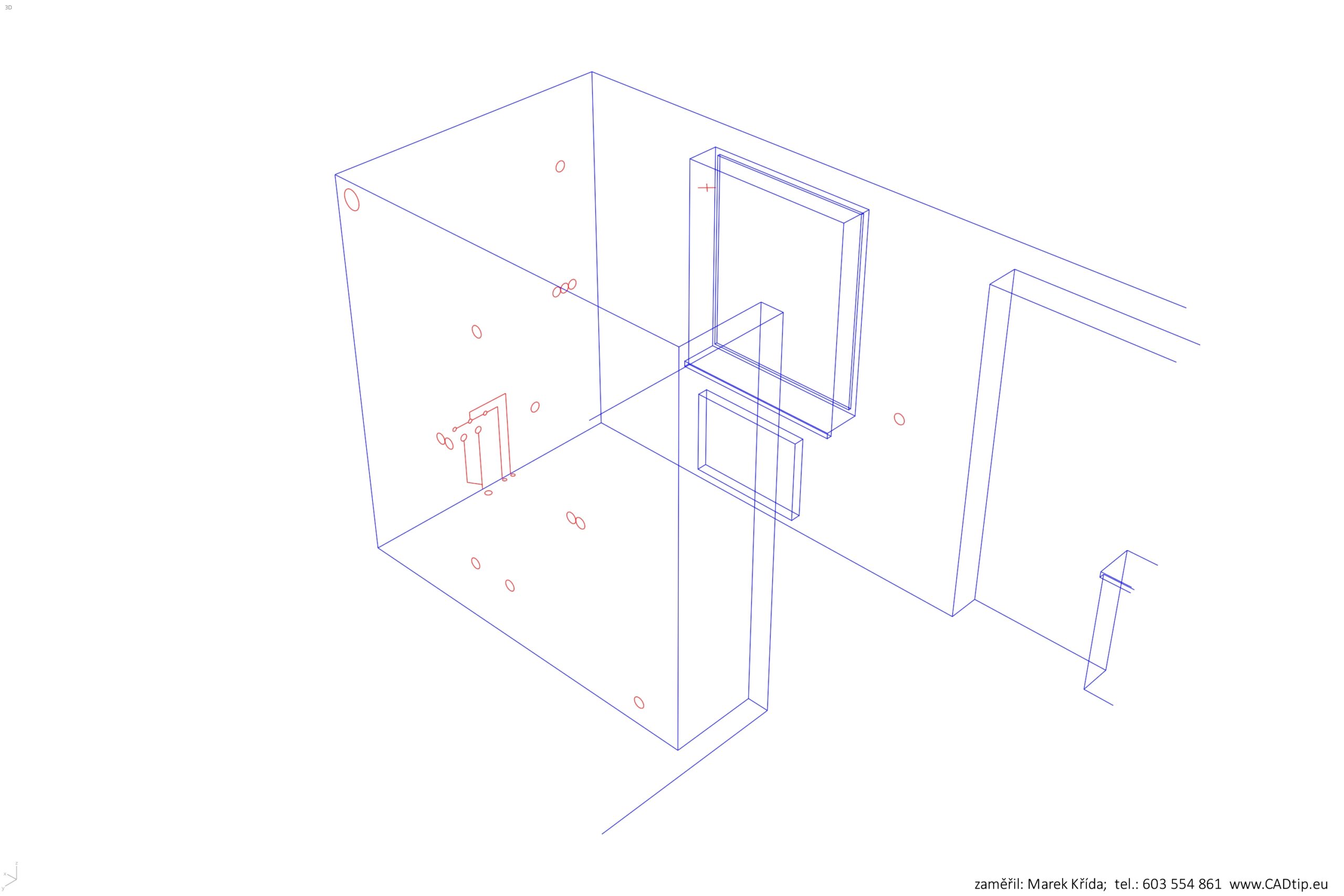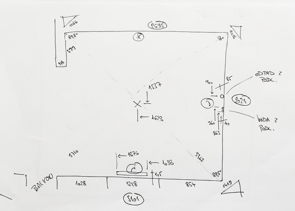 perspektiva půdorys stěna A stěna B stěna C - náčrtky od ruky ze zaměření (pro kontrolu)